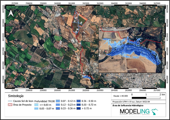 En etapas posteriores, el estudio se complementó con un análisis de inundación del Estero Batuco, dada su cercanía a la Línea de Transmisión Eléctrica (LTE), con el propósito de descartar posibles afectaciones al proyecto por crecidas fluviales.
